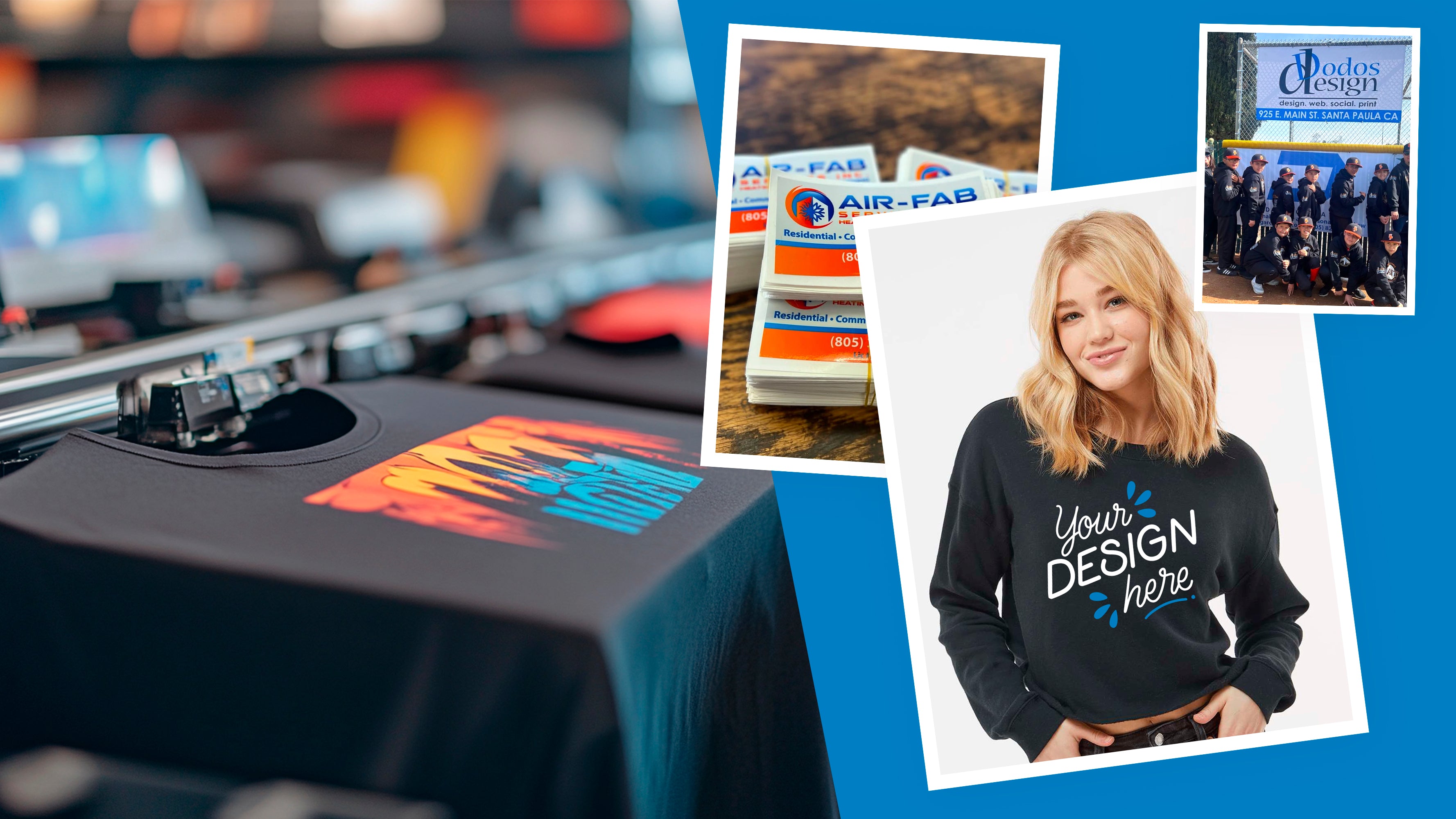 Get your custom designs printed on shirts, stickers, banners and more today.